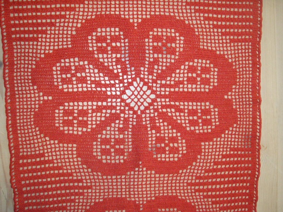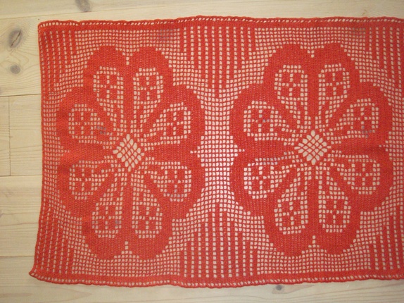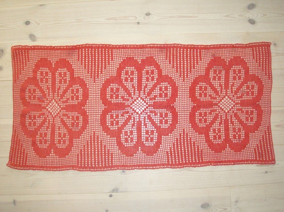 Heklet løper med tre blomstermotiv.Den er heklet i tynt bomullsgarn,ca 43 x 90 cm, mørk julerød.