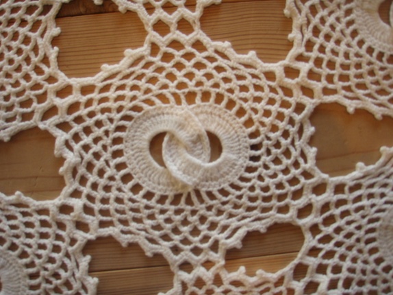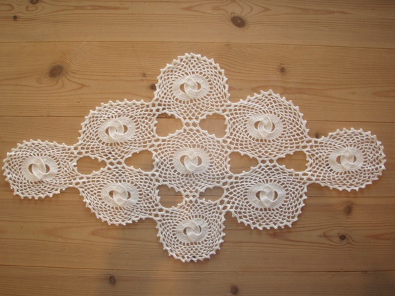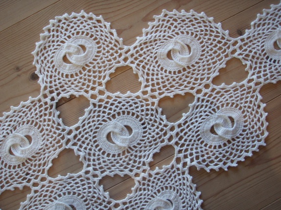 Heklet løper satt sammen av løse, runde motiv. Midten av hvert motiv er to sammenheklede rundinger.Den er heklet i tynt bomullsgarn,ca 37 x 68 cm, hvit.