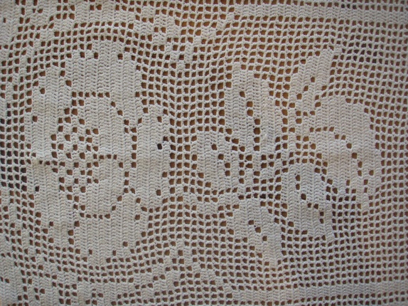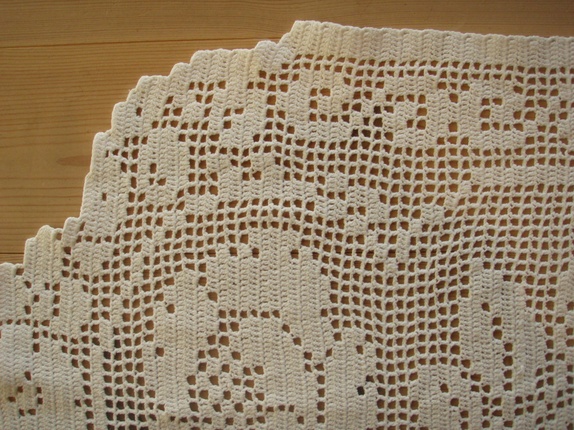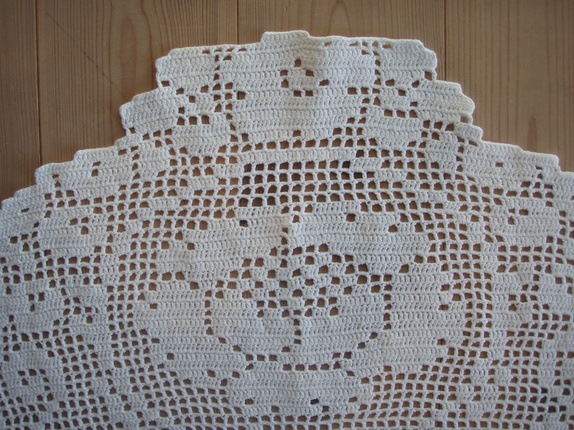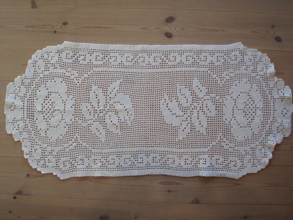 Heklet løper med rosemønster.Den er heklet i mellomtykt bomullsgarn,ca 45 x 100 cm, hvit.