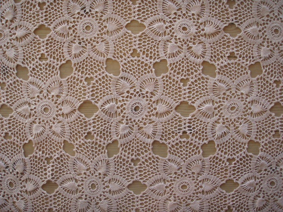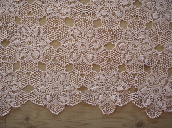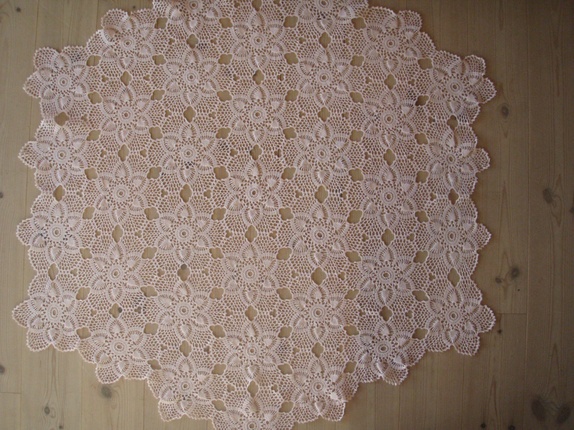 Sekskantet duk satt sammen av små brikker med blomstermotiv.Heklet i tynt. lysrosa bomullsgarn.ca 110 cm i diameter.