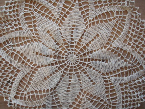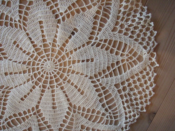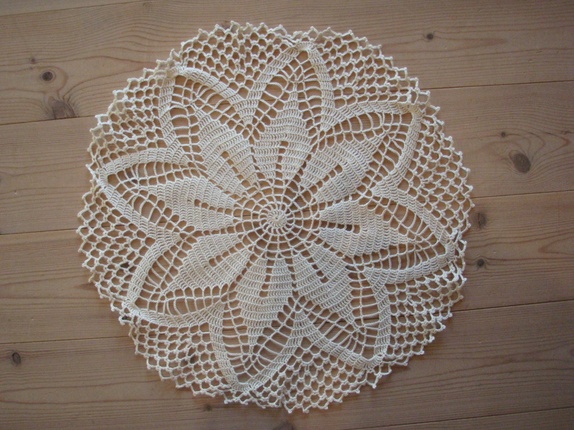 Rund brikke med stjernemotiv.Heklet i tynt, ubleket bomullsgarn.ca 47 cm i diameter.