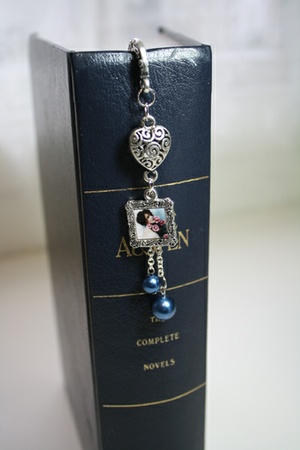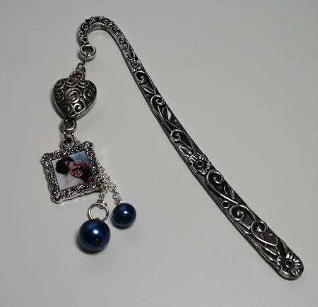 Bokmerke laget i metall med miniatyrbilde fra PrettyVintage, metallhjerte og perler i kjede.
