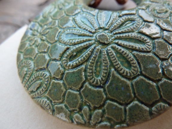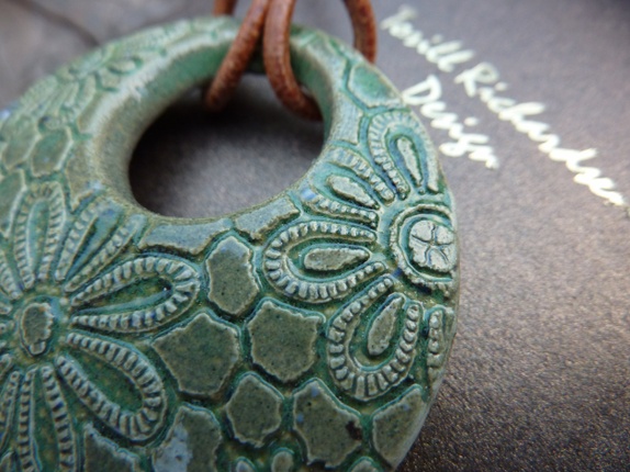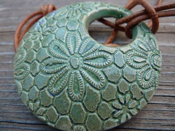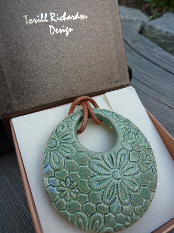 Halssmykke er laget av leirgods og har en diameter på 5,5 cm.Brun lærsnor med regulerbar knute.Smykke eske følger med.