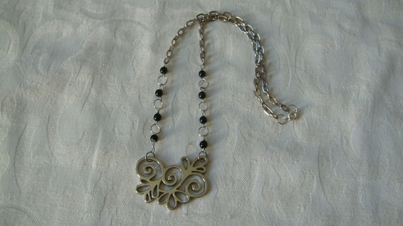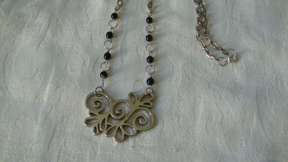 Hålsbåndet er laget av i sølvfarged mettal med 8 sorte perler. Ferdig ned priset se flere smykker i butikken