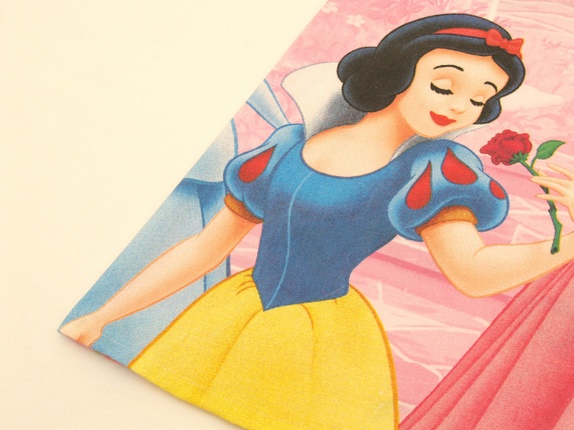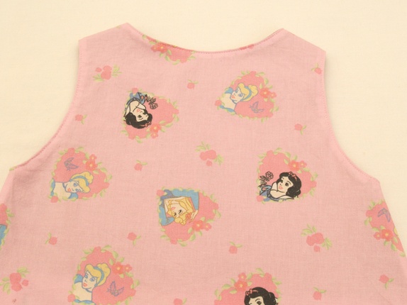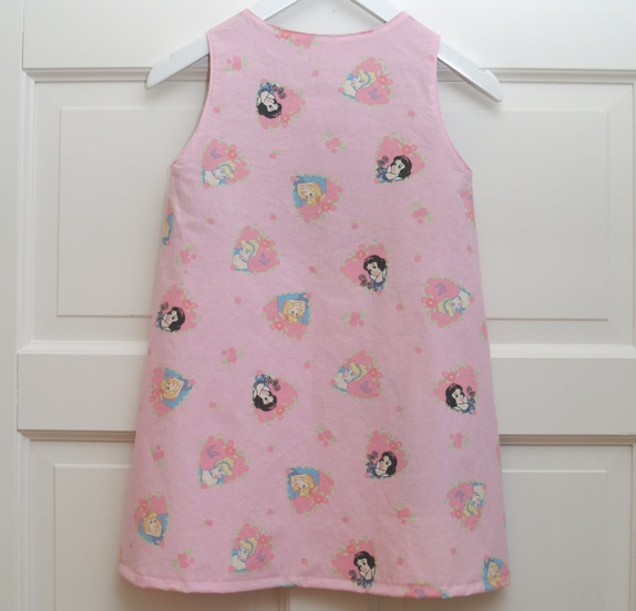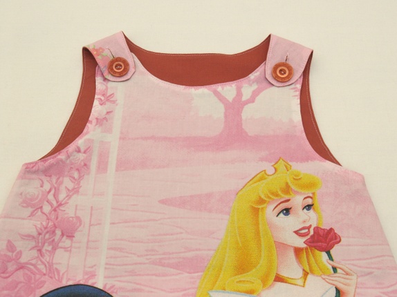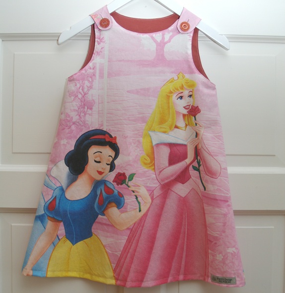 Hengslekjole sydd av et dynetrekk med prinsessemotiv. På forsiden er det én stor tegning av Snøhvit og Tornerose. På baksiden er det flere, små tegninger av Snøhvit, Tornerose, Askepott og små blomster. Alt på prinsesserosa bakgrunn. Kjolens overdel er foret med et mørkere rosa, ensfarget bomullsstoff. Mørk rosa knapper.