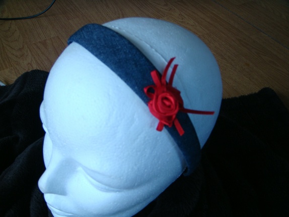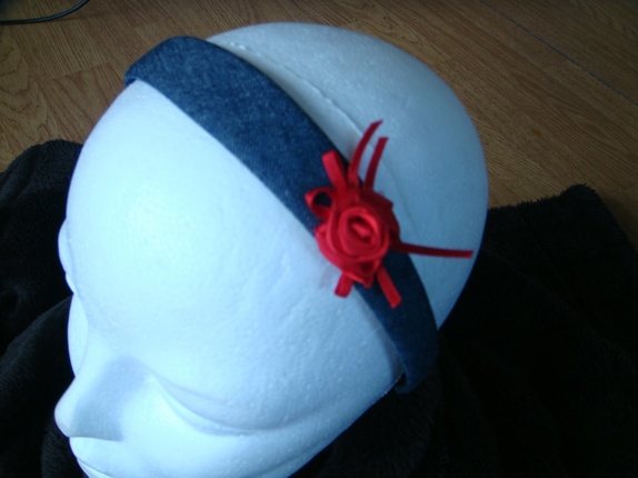 Hårbøylen er laget av plast ,som er trekkt med dongeri stoff.Den er pyntet med en silkerose Før 45,-