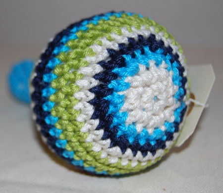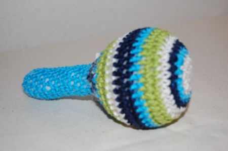 Babyrangle inspirert av 1970-tallet, heklet i bomullsgarn i ulike farger. Ranglen er fylt med fiberfyll, og har en liten bjelle inne i seg.