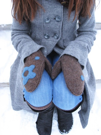 Brune ullvotter med blå blomster som varmer frosne fingre...