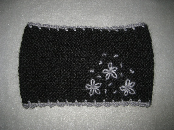 Strikka panneband med broderi og hekla kant. 60% mohair og 40% ull. Det blir smalare bakover, så det passar godt til hestehale eller oppsett hår.Kan vaskast med ullvaskemiddel på ullprogram eller for hand.