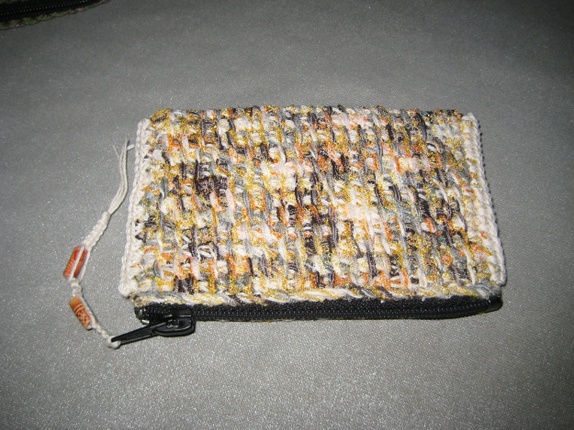 Lommebok i ein teknikk som heiter hakking. Ein liten makramepynt på glidelåsen. Hakka i to ulike trådar som gjer ein fin effekt.