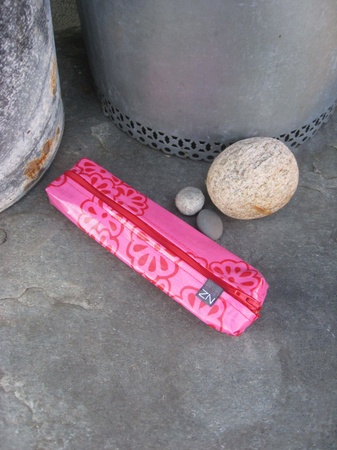 Pennalet er sydd i et knallrosa, vannavstøtende materiale med store røde blomster.