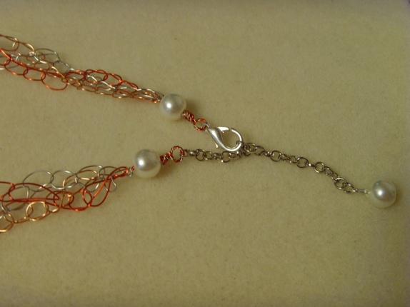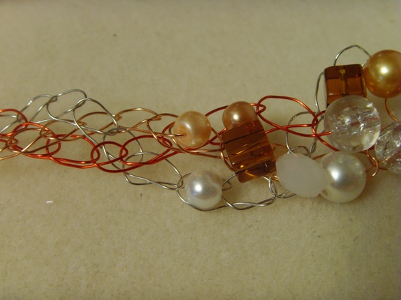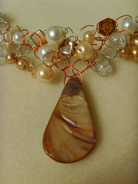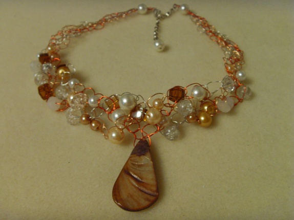 Kjedet er laget av kobber, røde og sølvfargede kobbertråder. Jeg har tredd på forskjellige perler av glass og krystall. Det henger et stort skjellanheng fra midten av kjedet. Kjedet ligger meget pent i halsgropen.