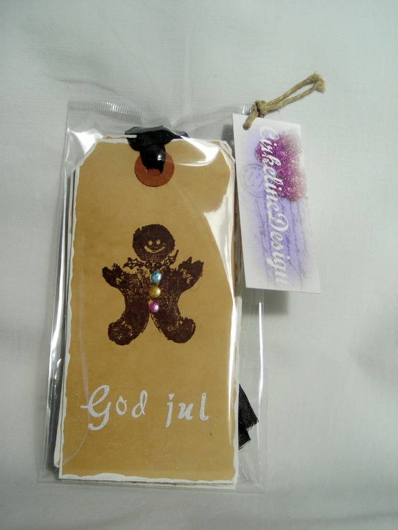Manilalappene er farget i kaffe for en vintage look. De er håndstemplet med en glad pepperkakemann i mørk brunt med sukkertøyfargede "knapper". "God jul" er stemplet med hvit embossing (forhøyning). Kantene er hvitmalte. På baksiden av lappene er det stemplet "Til" og "Fra", og det er god plass til å skrive en evt personlig hilsen. Sjokoladebrune sløyfebånd hører med.