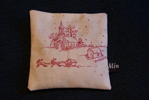 Lavendelposen har bunnfarge i offwhite med motiv i rødt - kirke og julenisse med reinsdyr. Posen har en bakside i offwhite bomull stoff.