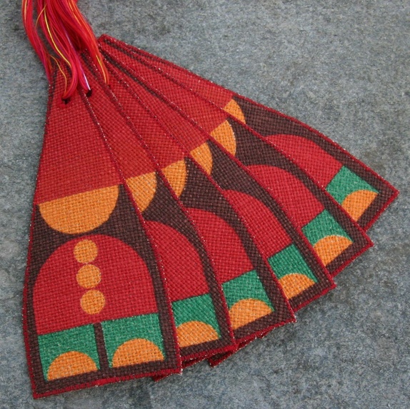 De er sydd av en brun strieduk fra loppis med morsomme nissefigurer i rødt, grønt og gult. Det er seks lapper i pakka.