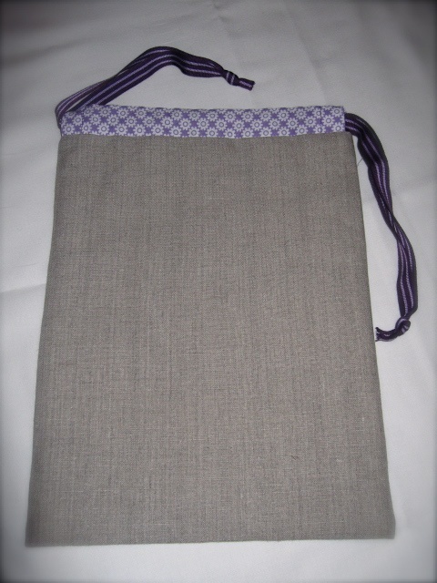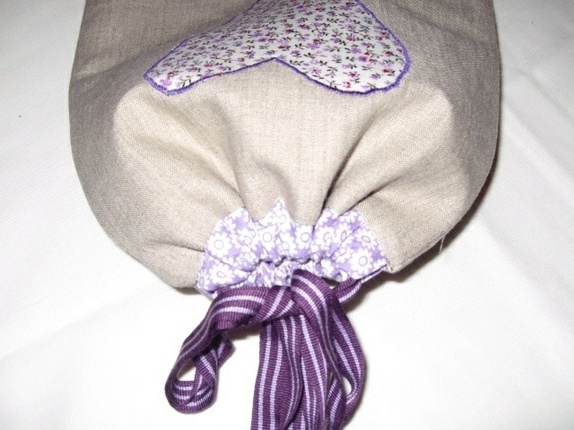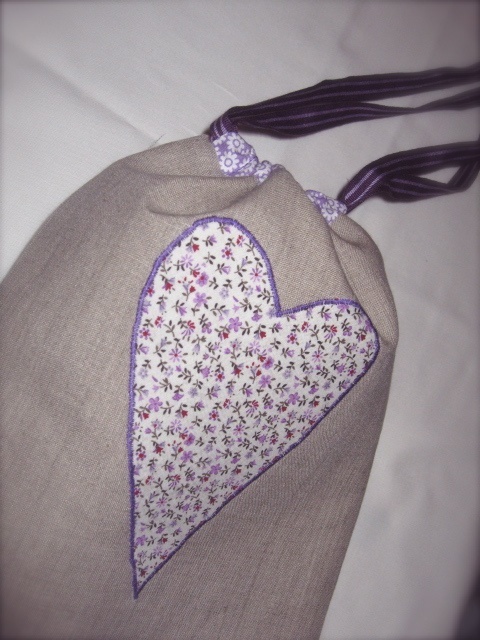 En fin pose laget av lin (ytterstoff) og foret med bomull. Snor i lilla. Applikert hjerte.