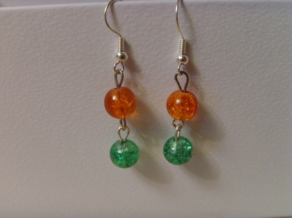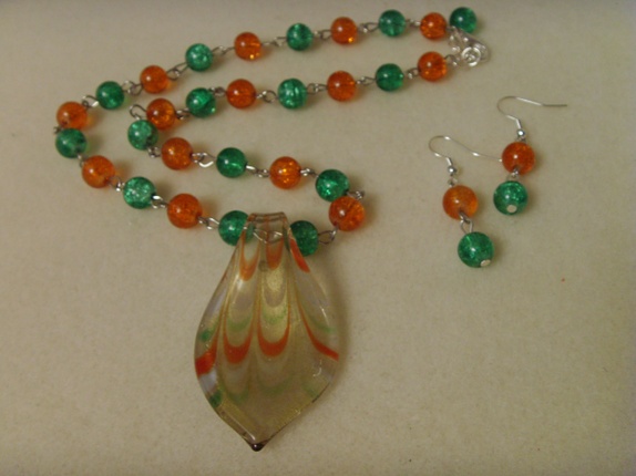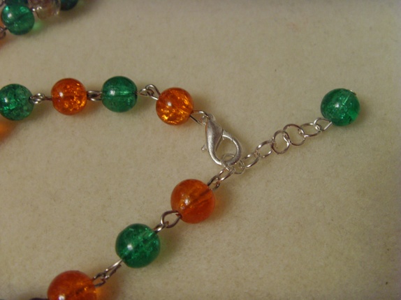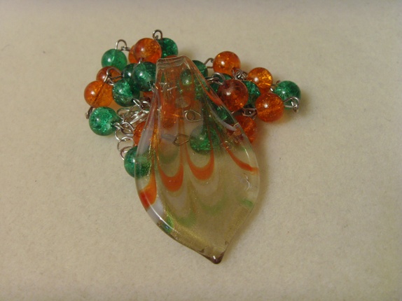 Smykket er ca 43 cm langt og består av grønne og oransje krakkelerte glassperler. Skjeanhenget er ca 6 cm langt.
