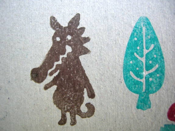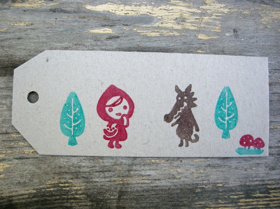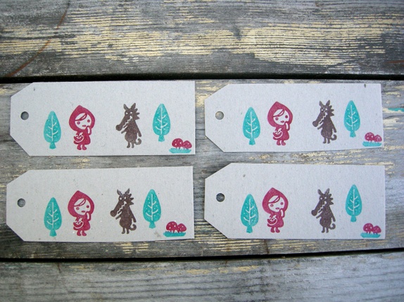 4 gavelapper med hånd stemplet motiv.Laget av gjenbruks matriale( Tykk rustikk kartong) Måler ca 11,5 cm lang og 5 cm bred.