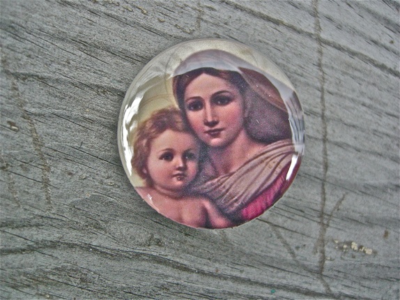 4 buttons med maria og jesus kommer i en liten gavepose.Måler 3,3 cm. Søt liten julegave..