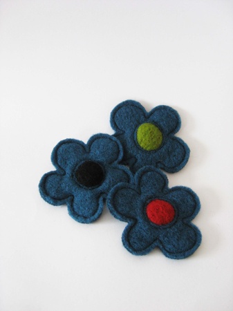 Brosjen er sydd i en kombinasjon av petroleum og sort i et tovet ullmateriale. På baksiden er det festet en sikkerhetsnål.