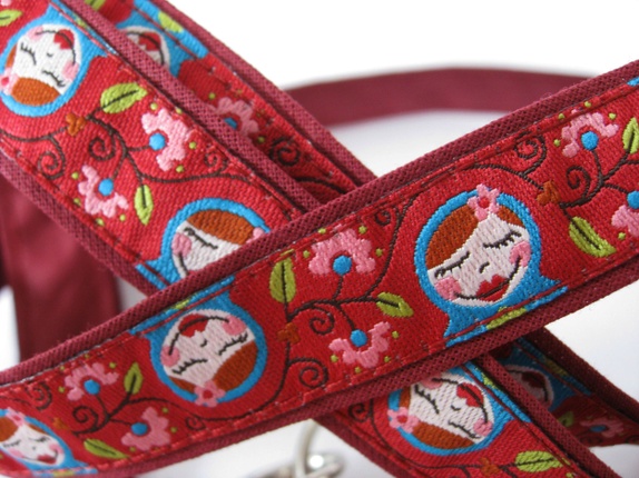 Nøkkelbånd sydd av nydelig, vevd bånd med skråbånd på baksiden. Båndet er dyp rødt med mønster av babuschkahoder og blomsterranke i turkis, rosa og grønt.