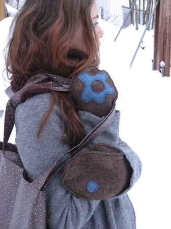 Brune ullvotter med blå blomster som varmer frosne fingre...