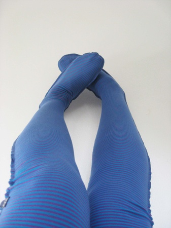 Lange, deilige knestrømper som rekker godt over knærne. De er sydd i rosa og mellomblå, smalstripete bomullsjersey. Knestrømpene er fasongsydd med en dekorativ overlocksøm på utsiden. De finnes i 2 størrelser: 36-38 og 39-41.