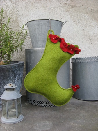Julestrømpe sydd i grønt, tovet ullmateriale med røde blomster. Alle blomstene har en vakker perle i midten.