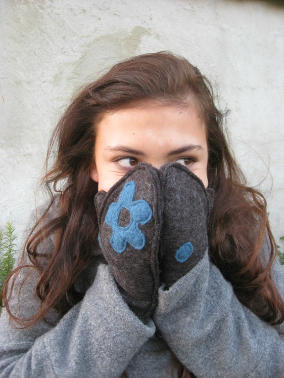 Brune ullvotter med blå blomster som varmer frosne fingre...