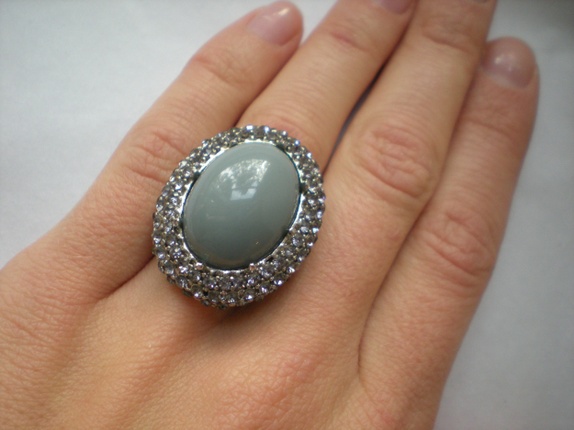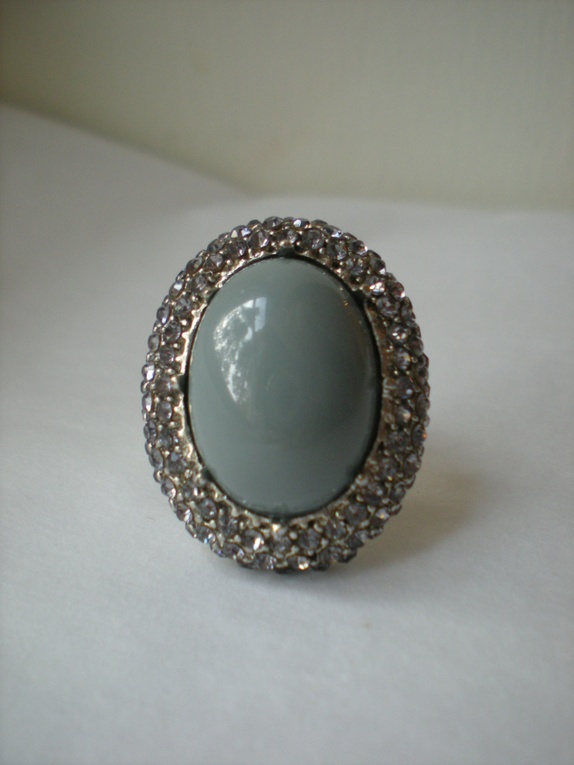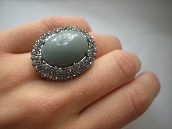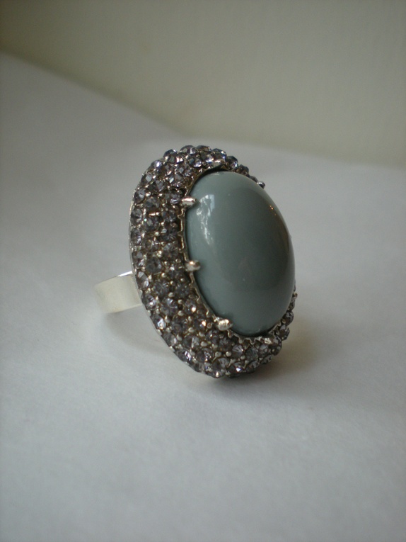 Oval ring i sølvfarget metall med grå/grønn halvkule i plast. Rundt denne er det glitrende strass-stener.