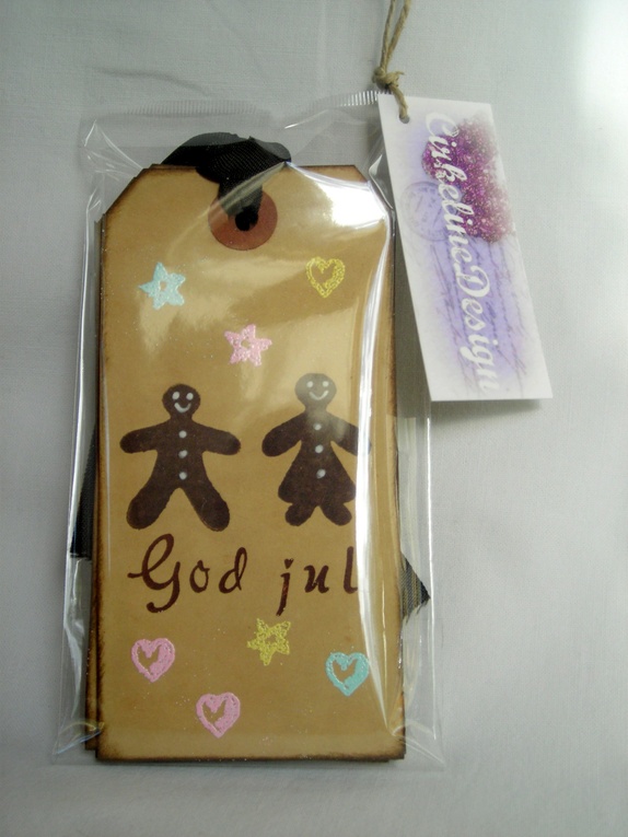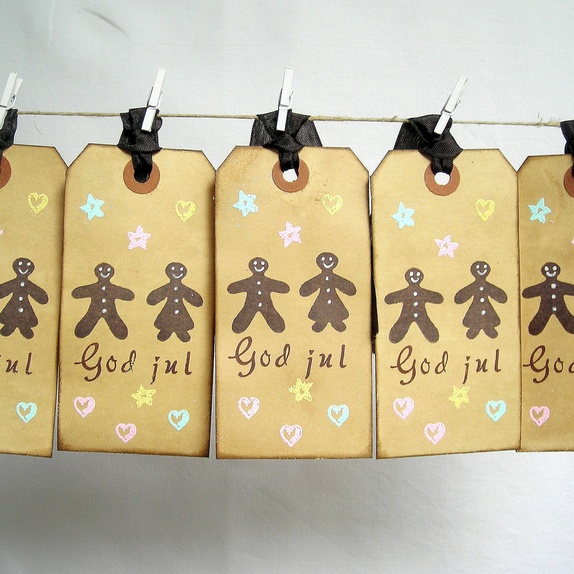 Lappene er badet i kaffe og svertet i kantene for en vintage look. De er stemplet med et pepperkakepar og "God jul" i mørk brunt. Rundt er det embosset små stjerner og hjerter i sukkertøyfarger. På baksiden av lappene er det stemplet "Til" og "Fra".