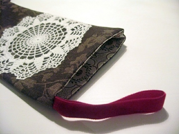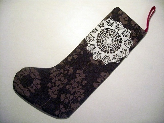 Enkel julestrømpe sydd av lin i varme bruntoner og pyntet med heklet blondebrikke.