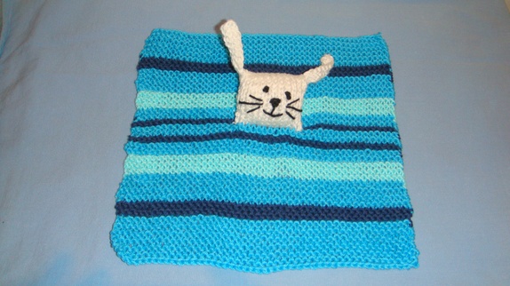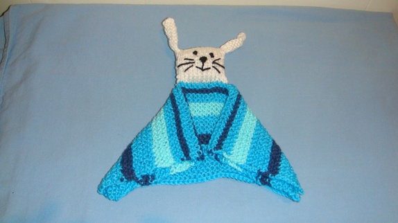 Koseklut kaninen er strikket i bomull.Målene på kluten når den er brettet helt ut er lengde 21 cm ,bredde 22 cm. kan vaskes i maskin