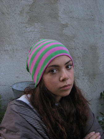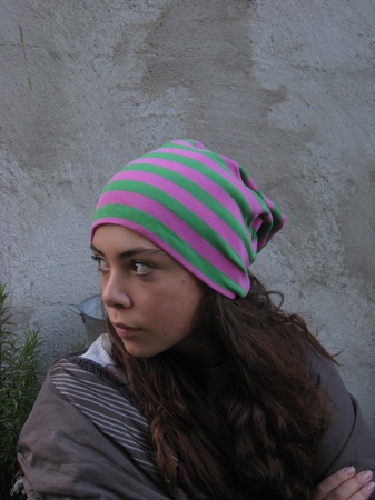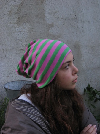 Stripete grønn og rosa lue i bomullsjersey