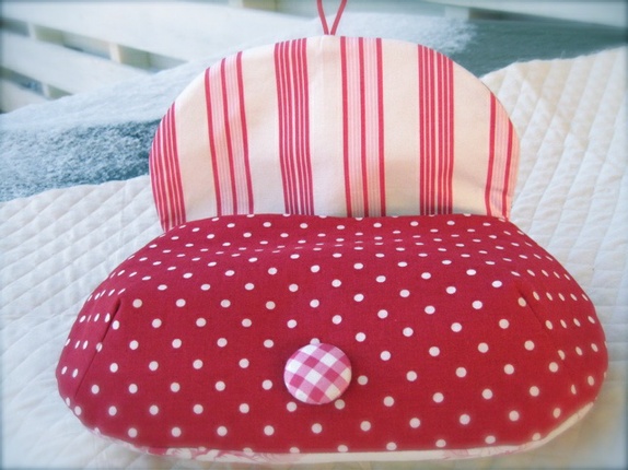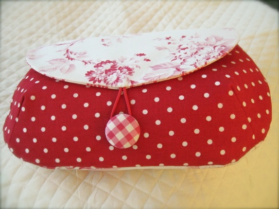 - Toalettmappe laget i bomull, med roser på hvit bunn og hvite prikker.