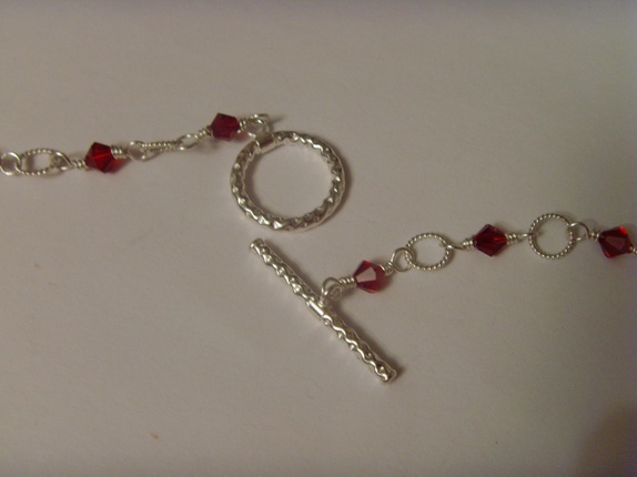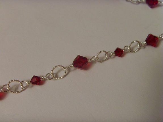 Halskjedet er 48 cm langt og består av 4mm og 6mm swarovski bicone krystaller tredd på 925s sterling sølv wire. Mellomdelene er 6 mm vridde 925s lukkede ringer. Låsen består også av 925s sterling sølv.
