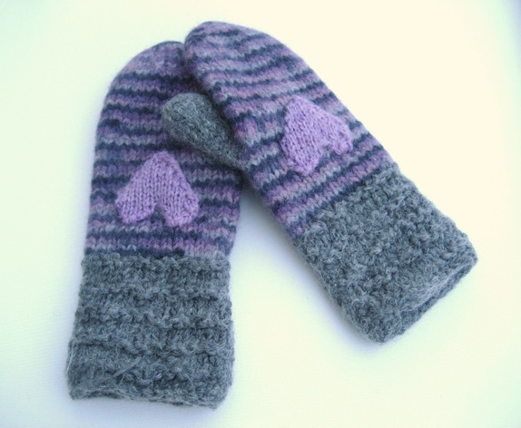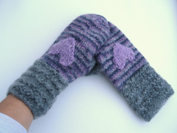 Skjønne og varme votter strikket i grå og flerfarget ull i lillatoner, deretter tovet. Vottene er pyntet med hvert sitt strikkehjerte i lilla mohair.