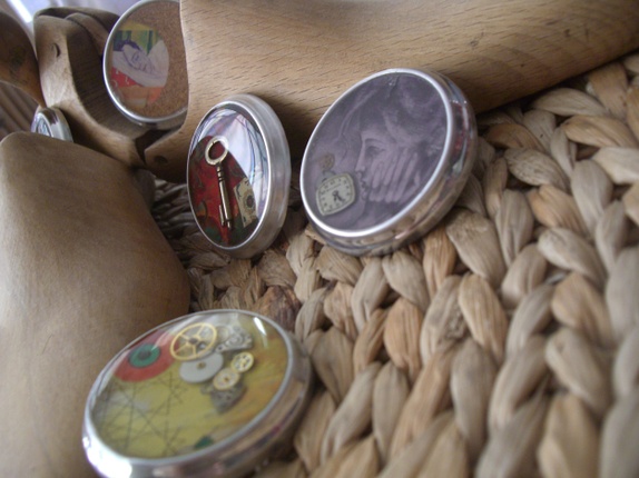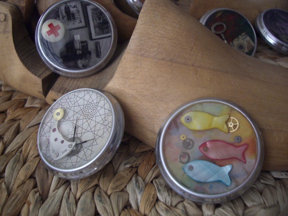 Bottoms Up brosjene er et nytt prosjekt basert på gjenbruk. Brosjene er laget av resirkulerte aluminium bokser som klippes,behandles med filer, sandpapir og til slutt med scotch-brite eller poleringsmiddel for å få en fin overflate. Hver eneste brosje får et tema og fylles med en spesiell type lim (resin)som ligner på glass etter 24 timer når den er herdet. Bildene jeg bruker til brosjene mine kommer fra gamle kunstkataloger eller interiørblader og gjenstander som kommer inn i dem er også vanligvis loppefunn!