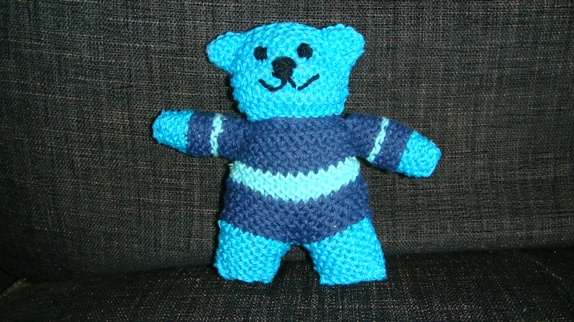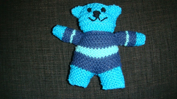 Den lille turkise bamsen er strikket i bomull og fylt med fyllvatt.Øyne,nese og munn er brodert på.Bamsen er 13 cm lang. Passer fint som baby`s første bamse .