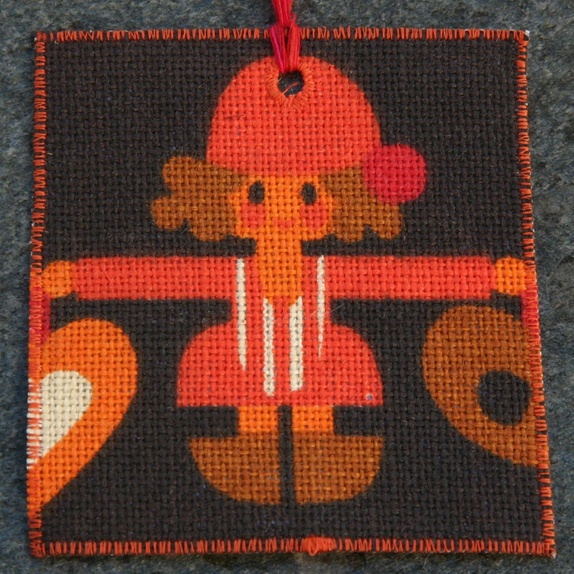Disse er sydd av en brun strieduk fra loppis med morsomme nissejenter og -gutter. Det er sydd rundt kanten med oransje tråd. Åtte lapper i pakka, fire av hver.