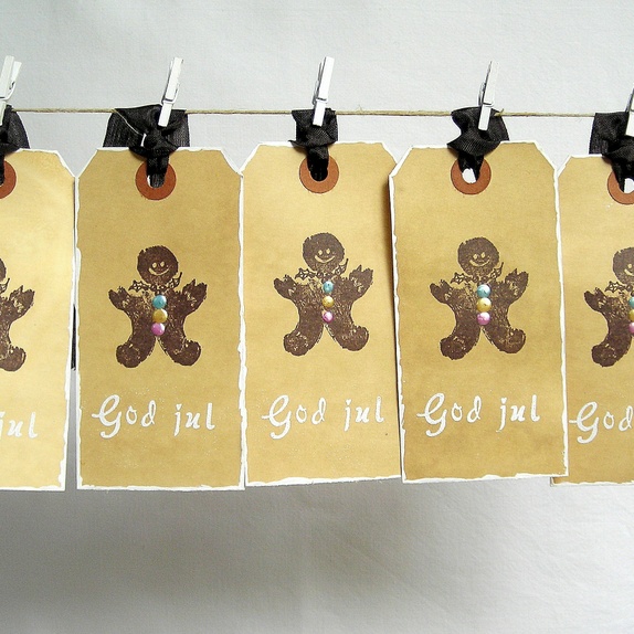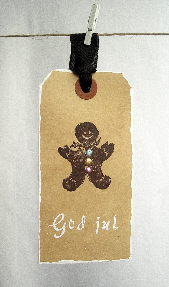 Manilalappene er farget i kaffe for en vintage look. De er håndstemplet med en glad pepperkakemann i mørk brunt med sukkertøyfargede "knapper". "God jul" er stemplet med hvit embossing (forhøyning). Kantene er hvitmalte. På baksiden av lappene er det stemplet "Til" og "Fra", og det er god plass til å skrive en evt personlig hilsen. Sjokoladebrune sløyfebånd hører med.