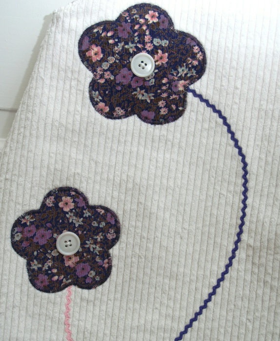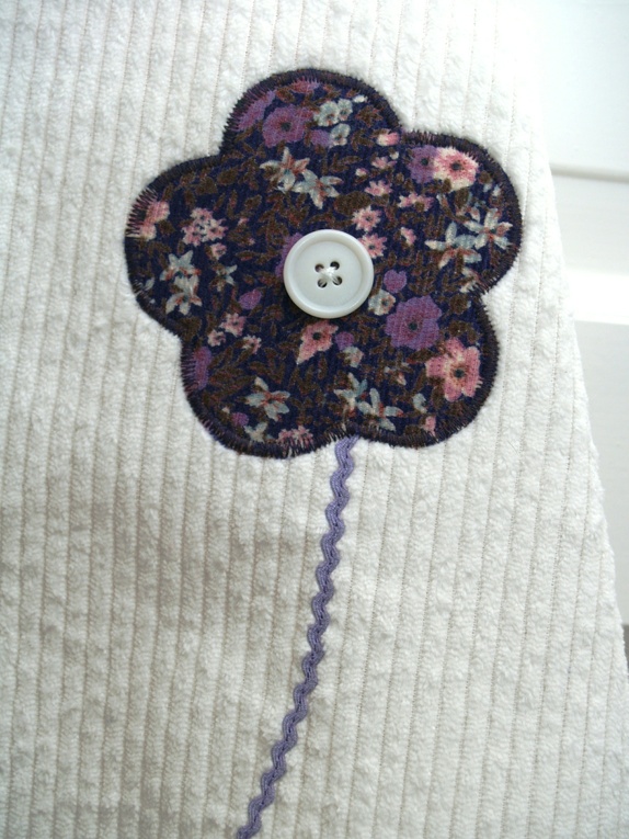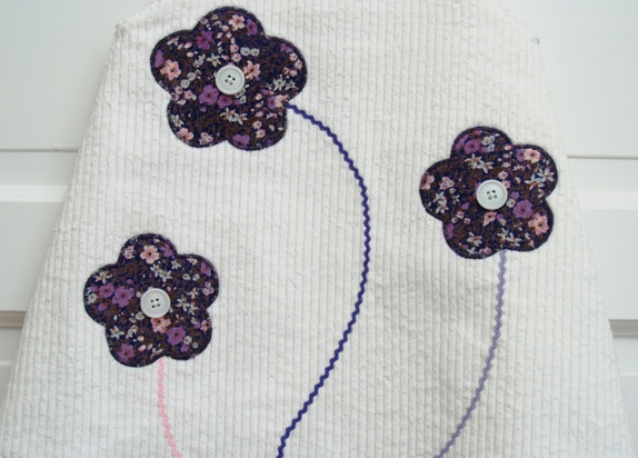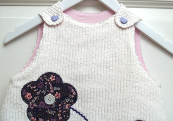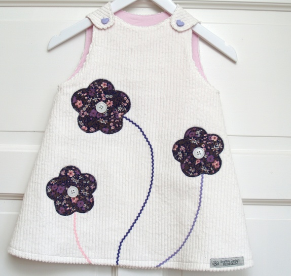 Søt, slitesterk hengslekjole, sydd av en kraftig, hvit cordfløyelsgardin. Kjolen er helt hvit på baksiden. På forsiden er kjolen pyntet med tre applikerte blomster i rosa og lilla, som står på svaiende stilker av kroklisser i lys lilla, mørk lilla og rosa. Blomstene er også fra cordfløyelsgardiner, og de er pyntet med en hvit knapp i midten. Lys lilla hjerteknapper i selene. Kjolens overdel er foret med et ensfarget rosa bomullsstoff.