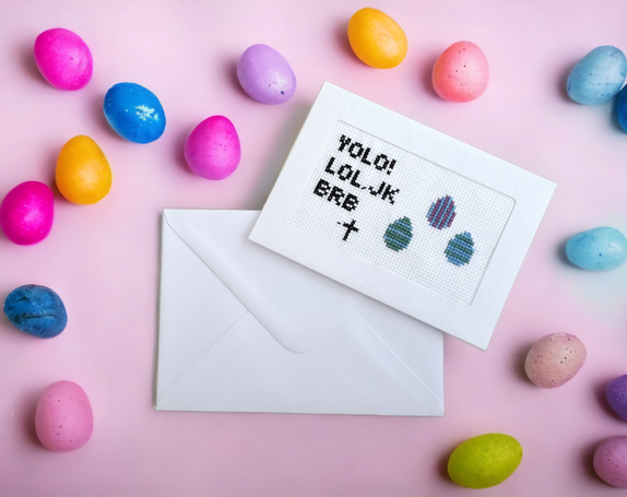 Søkeord: korssting, broderi, kort, gave, dekor, morsom, humor, påske, påskeegg, kors, religion