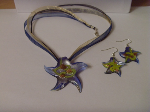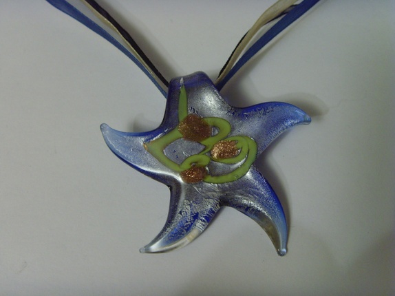Nydelig blått stjerneanheng som henger på organzabånd i tilsvarende farger. Smykket er ca 46 cm langt og selve anhenget er ca 4 cm.