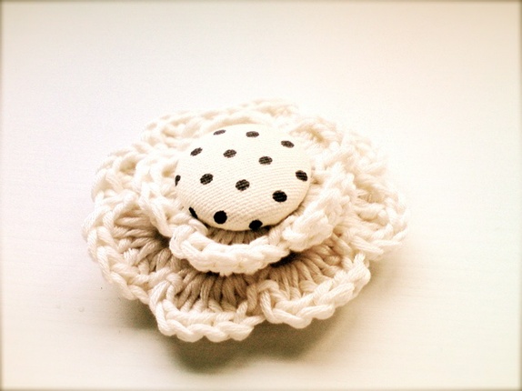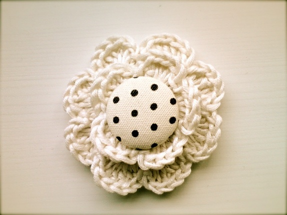 Heklet blomst i kremfarget bomullsgarn med knapp trukket i stoff - små brune prikker på kremfarget bunn.