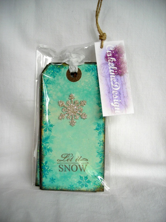 De er farget med en stilig lys turkis farge med stemplede snøkrystaller i kantene og en stor snøkrystall med sølv glassglitter som midtpunkt. "Let it snow" er håndstemplet i sjokoladenbrunt.