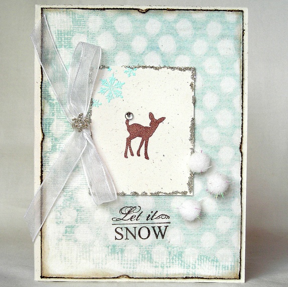 Det er pyntet med vinterlig, lys turkisblått mønsterpapir, et håndstemplet motiv av et lite dådyr med bling på haletuppen og embossede (forhøyede) snøfnugg, pluss en hvit chiffonsløyfe med snøkrystall og tre morsomme snøballer. "Let it snow" er håndstemplet i sjokoladebrunt.