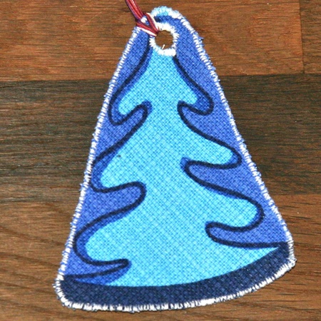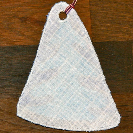 Søte julegavelapper sydd av en liten blå og turkis julebrikke med grantrær og hvite nisser på. Disse kommer til å havne på juletreet etter at gavene er pakket opp!