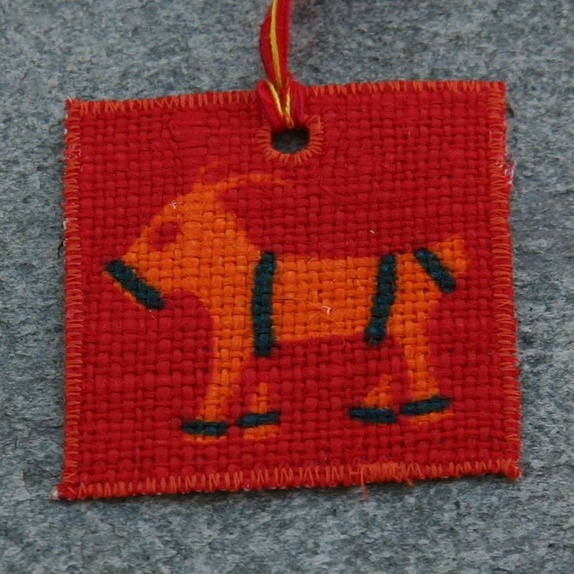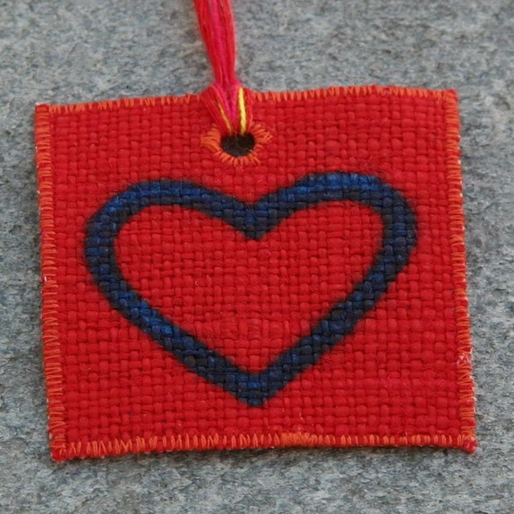 Gavelappene er sydd av en liten strieduk fra loppis med hjerter, lysestaker og julebukk. Hver pakke har åtte lapper, to av hvert motiv.