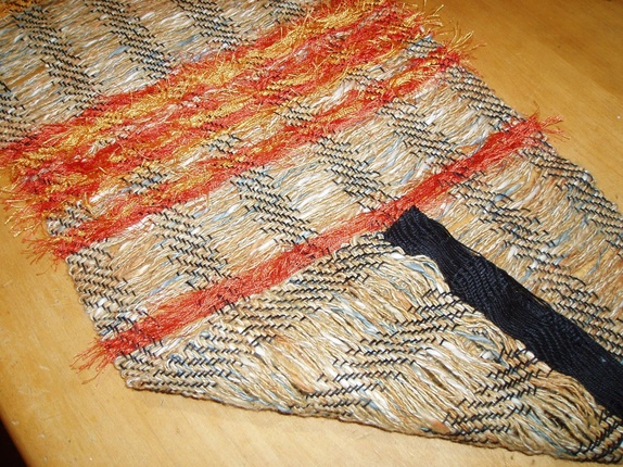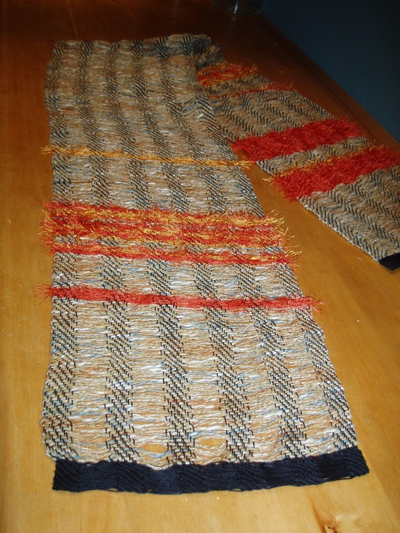 SALG:Skjerf på sort bomullsrenning og råsilke i innslag og gul/orange viskose. Åpne felter i renningen gir en spennende effekt der innslaget kommer godt fram. Håndvask 40 grader. Størrelse 23x165 cm.